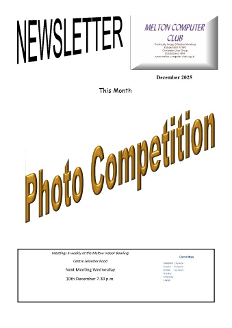 All meetings are on a Wednesday and start at 7.30pmThe next meeting is on 14th Jan 2026 The topic is A.G.M. |