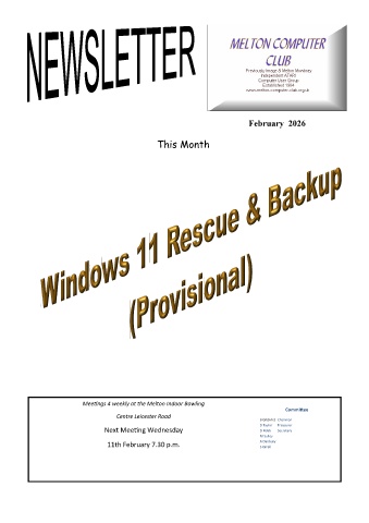 All meetings are on a Wednesday and start at 7.30pmThe next meeting is on 11th Feb 2026 The topic is Windows 11 Rescue & Backup (Provisional). |