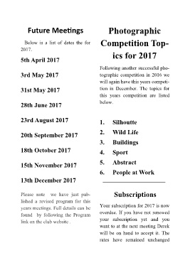 years meetings. Full details can be Your subscription for 2017 is now