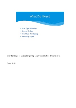 What Do I Need What Type of Backup Storage Medium How Often Do I Backup How Many Copies Our thanks go to Derek for giving a very informative presentation. Dave Robb