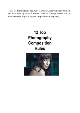 There are dozens of rules and styles to consider, some very important, oth- ers, well that’s up to the individual. Here are some guidelines that you may find useful in producing that competition winning entry. 12 Top Photography Composition Rules