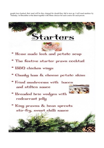 people have booked, their meal will be they charged for should they fail to turn up. I will need numbers by Thursday 1st December at the latest together with Menu choices for each course for each person.