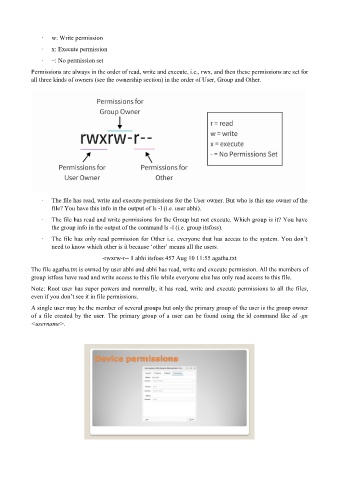 The file agatha.txt is owned by user abhi and abhi has read, write and execute permission. All the members of