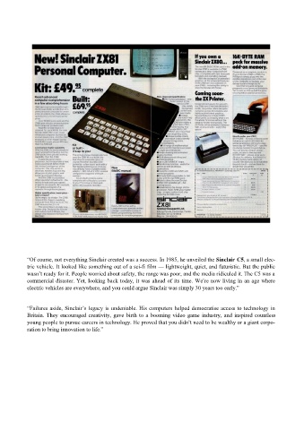 “Of course, not everything Sinclair created was a success. In 1985, he unveiled the Sinclair C5, a small elec-