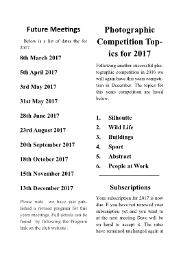 years meetings. Full details can be at the next meeting Dave will be