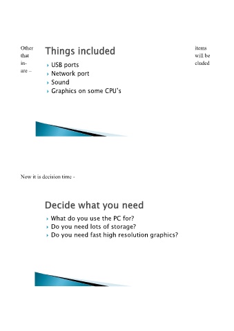 Other items that will be in- USB ports cluded are – Network port Sound Graphics on some CPU’s Now it is decision time - What do you use the PC for? Do you need lots of storage? Do you need fast high resolution graphics?
