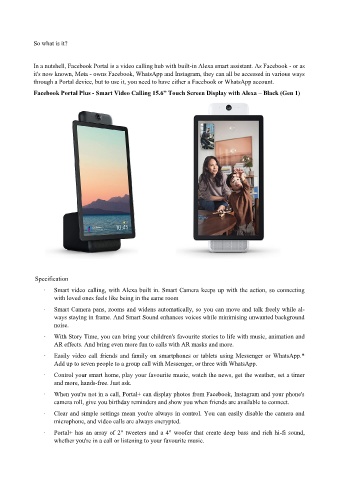In a nutshell, Facebook Portal is a video calling hub with built-in Alexa smart assistant. As Facebook - or as