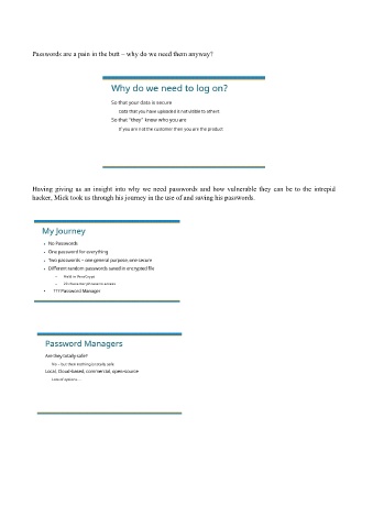 Passwords are a pain in the butt – why do we need them anyway? Having giving us an insight into why we need passwords and how vulnerable they can be to the intrepid hacker, Mick took us through his journey in the use of and saving his passwords.
