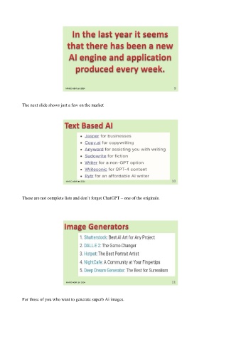 The next slide shows just a few on the market These are not complete lists and don’t forget ChatGPT – one of the originals. For those of you who want to generate superb Ai images.