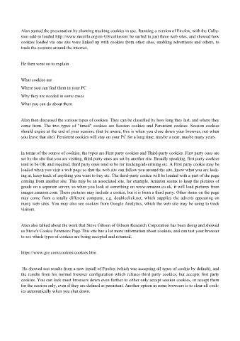 Alan started the presentation by showing tracking cookies in use. Running a version of Firefox, with the Collu-